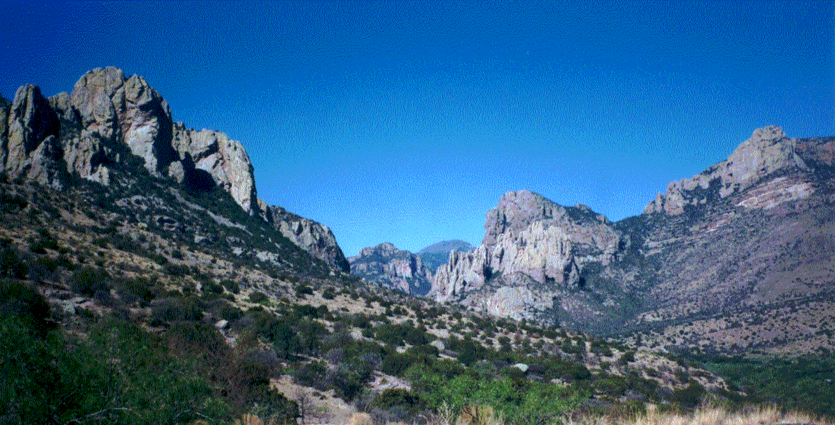 lichen-covered rhyolite cliffs that embrace ribbons of sycamores and